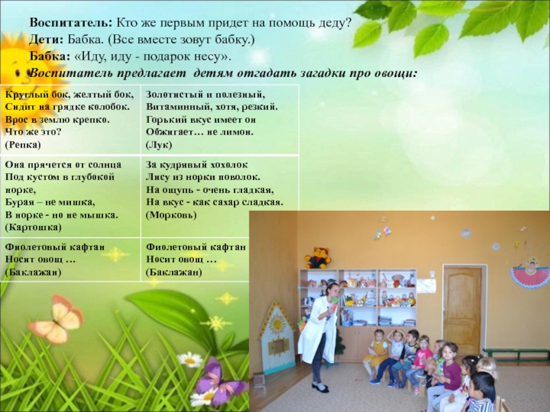 Воспитатель предлагает детям отгадать загадки про овощи: