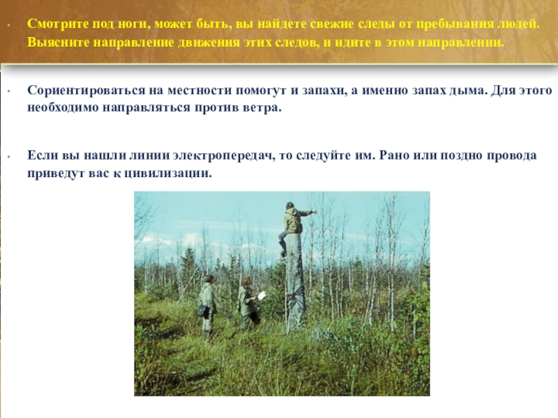 Смотрите под ноги, может быть, вы найдете свежие следы от пребывания людей. Выясните направление движения этих следов,