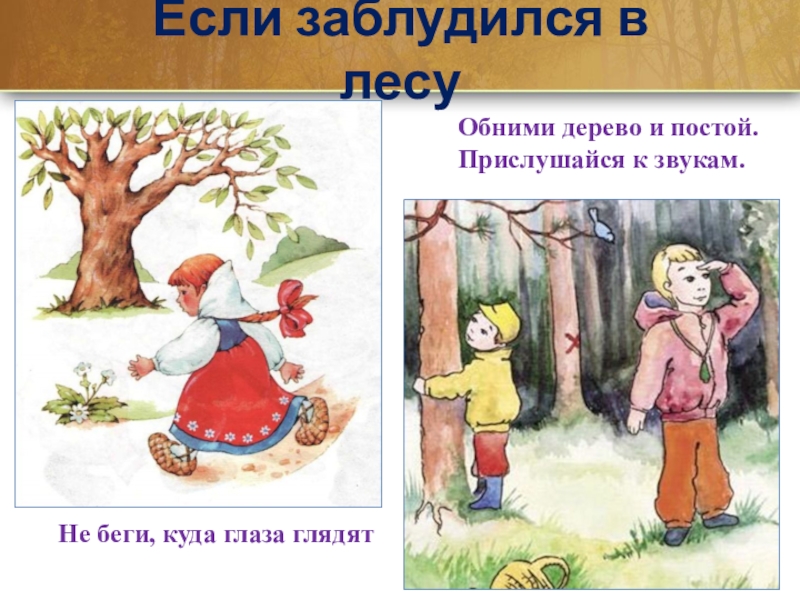 Если заблудился в лесуОбними дерево и постой.Прислушайся к звукам.Не беги, куда глаза глядят