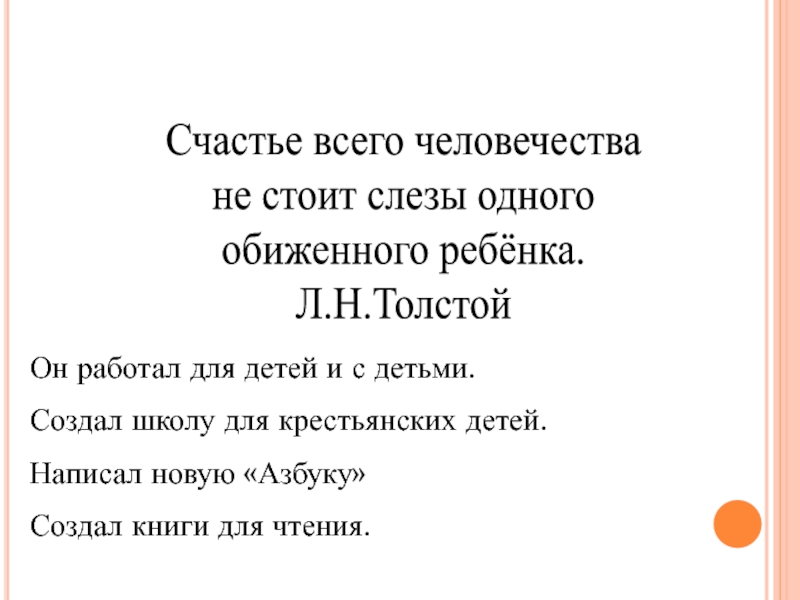 Счастье всего человечестване стоит слезы одногообиженного ребёнка.Л.Н.ТолстойОн работал для детей и с детьми. Создал школу для крестьянских