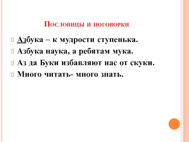 Пословицы и поговорки Азбука – к мудрости ступенька.Азбука наука, а ребятам мука.Аз да Буки избавляют нас от скуки.Много читать-