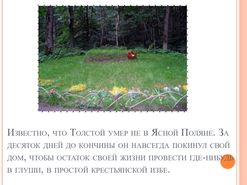 Слайд 12Известно, что Толстой умер не в Ясной Поляне. За десяток дней
