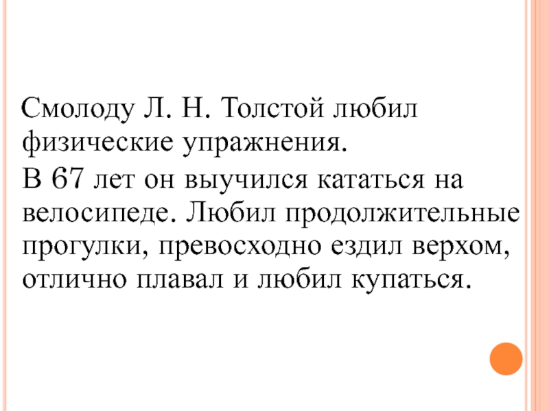 Смолоду Л. Н. Толстой любил физические упражнения.  В 67 лет он выучился кататься на