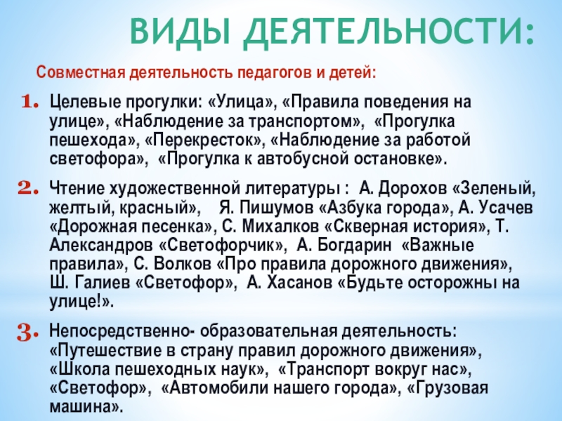 Чтение художественной литературы : А. Дорохов «Зеленый, желтый, красный», Я. Пишумов «Азбука города», А. Усачев «Дорожная песенка», С. Михалков «Скверная история», Т. Александров «Светофорчик», А. Богдарин «Важные правила», С. Волков «Про правила дорожного движения», Ш. Галиев «Светофор», А. Хасанов «Будьте осторожны на улице!».