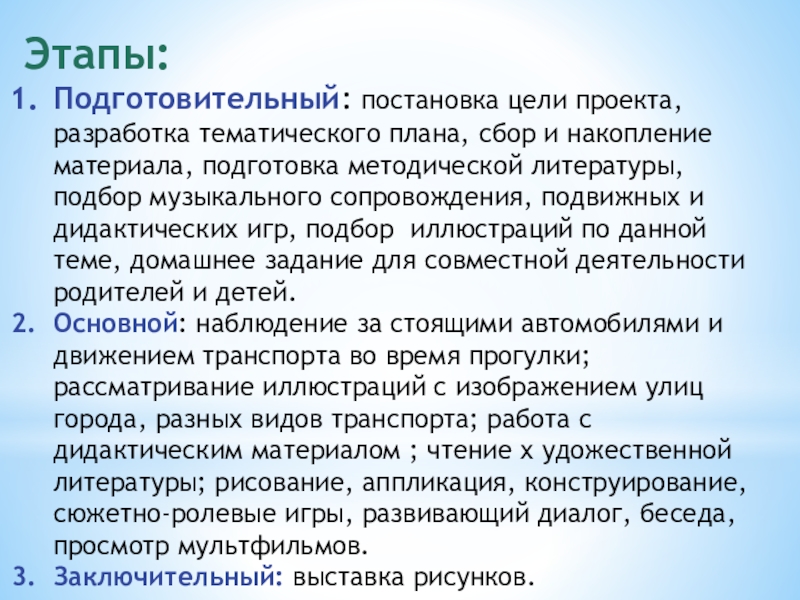Подготовительный: постановка цели проекта, разработка тематического плана, сбор и накопление