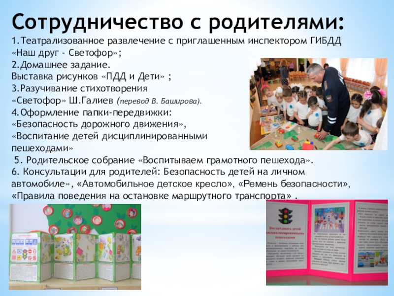6. Консультации для родителей: Безопасность детей на личном автомобиле», «Автомобильное детское кресло», «Ремень безопасности», «Правила поведения на остановке маршрутного транспорта» .