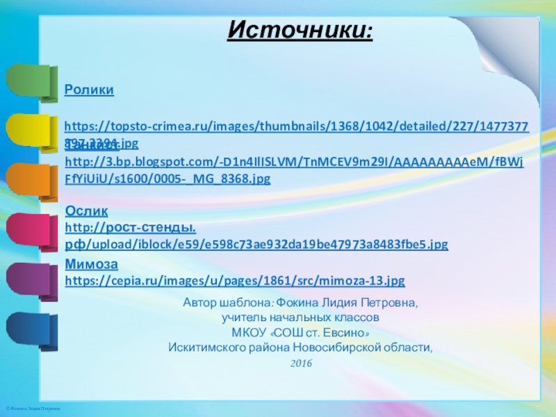 Источники:Ролики https://topsto-crimea.ru/images/thumbnails/1368/1042/detailed/227/1477377897.3394.jpgМимоза https://cepia.ru/images/u/pages/1861/src/mimoza-13.jpgТанкист http://3.bp.blogspot.com/-D1n4IlISLVM/TnMCEV9m29I/AAAAAAAAAeM/fBWjFfYiUiU/s1600/0005-_MG_8368.jpgОсликhttp://рост-стенды.рф/upload/iblock/e59/e598c73ae932da19be47973a8483fbe5.jpgАвтор шаблона: Фокина Лидия Петровна, учитель начальных классовМКОУ «СОШ ст. Евсино» Искитимского района Новосибирской