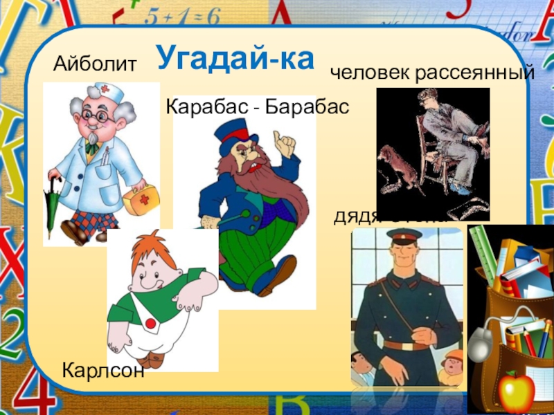 Угадай-качеловек рассеянныйАйболитКарабас - Барабасдядя СтёпаКарлсон