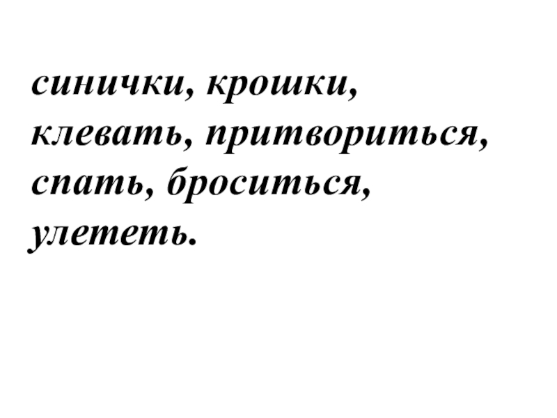 Слайд 3синички, крошки, клевать, притвориться, спать, броситься, улететь.