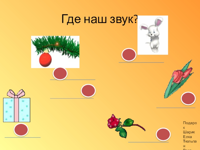 Где наш звук?ПодарокШарикЕлкаТюльпанРозазаяц