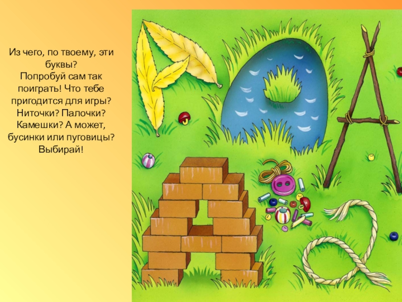 Слайд 17Из чего, по твоему, эти буквы? Попробуй сам так поиграть! Что тебе