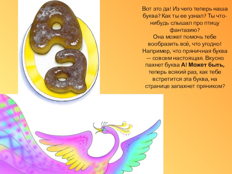 узнал? Ты что- нибудь слышал про птицу фантазию? Она может помочь тебе вообразить всё, что угодно! Например, что пряничная буква — совсем настоящая. Вкусно пахнет буква А! Может быть, теперь всякий раз, как тебе встретится эта буква, на странице запахнет пряником?