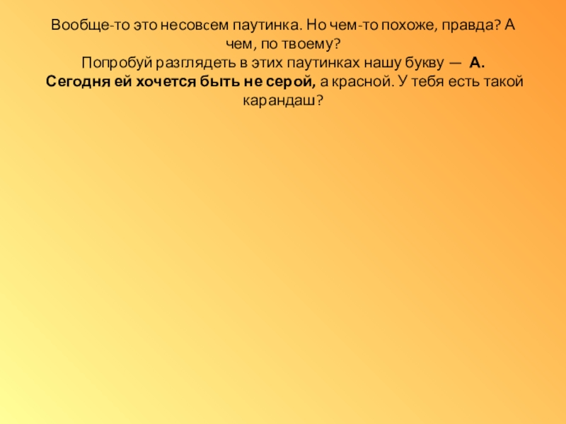 твоему? Попробуй разглядеть в этих паутинках нашу букву — А. Сегодня ей хочется быть не серой, а красной. У тебя есть такой карандаш?