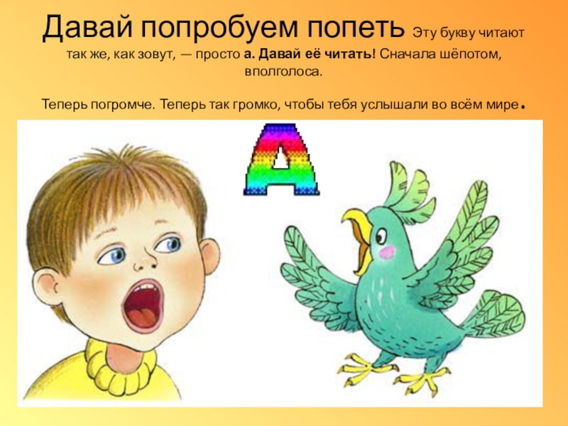 Давай попробуем попеть Эту букву читают так же, как зовут, — просто а. Давай её читать! Сначала