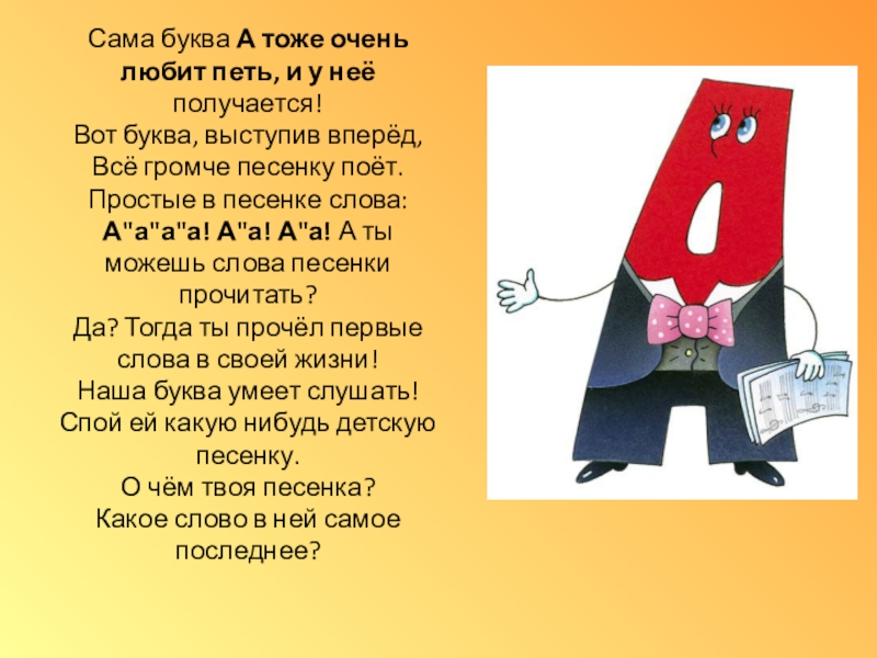 буква, выступив вперёд, Всё громче песенку поёт. Простые в песенке слова: А"а"а"а! А"а! А"а! А ты можешь слова песенки прочитать? Да? Тогда ты прочёл первые слова в своей жизни! Наша буква умеет слушать! Спой ей какую нибудь детскую песенку. О чём твоя песенка? Какое слово в ней самое последнее?