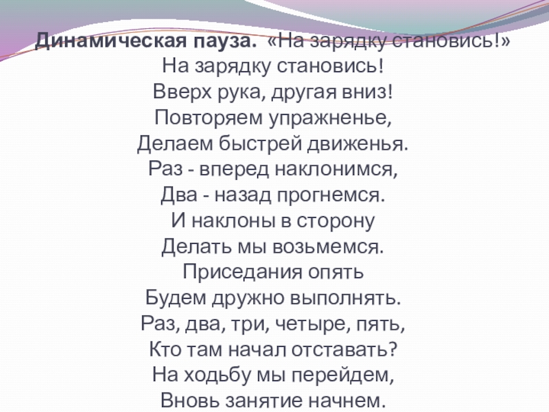 Слайд 7Динамическая пауза. «На зарядку становись!» На зарядку становись! Вверх рука, другая