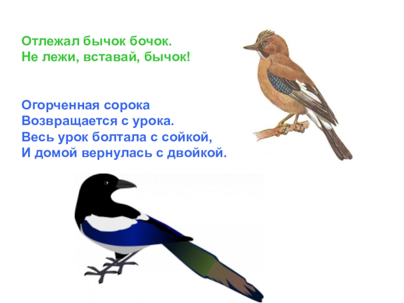 Отлежал бычок бочок. Не лежи, вставай, бычок!Огорченная сорока Возвращается с урока. Весь урок болтала с сойкой, И