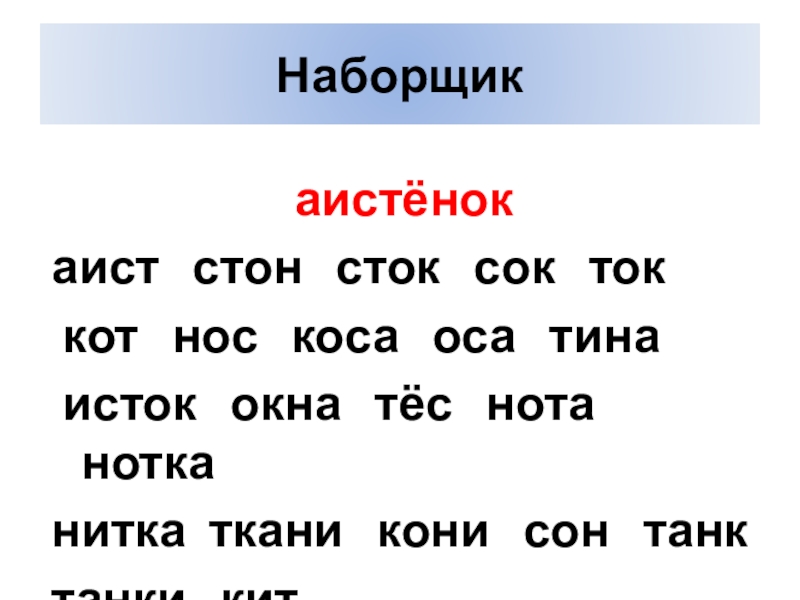 Наборщикаистёнокаист  стон  сток  сок  ток  кот  нос  коса  оса