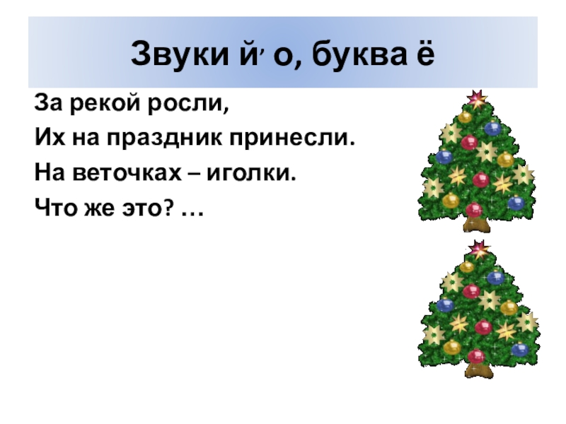 Звуки й, о, буква ёЗа рекой росли,Их на праздник принесли.На веточках – иголки.Что же это? …
