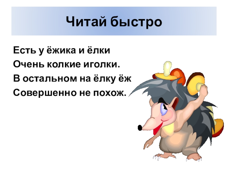 Читай быстроЕсть у ёжика и ёлкиОчень колкие иголки.В остальном на ёлку ёжСовершенно не похож.