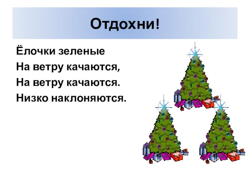 Отдохни!Ёлочки зеленыеНа ветру качаются,На ветру качаются.Низко наклоняются.