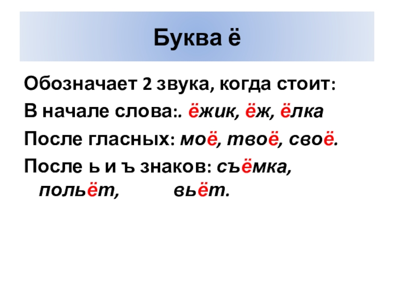 Буква ёОбозначает 2 звука, когда стоит:В начале слова:. ёжик, ёж, ёлкаПосле гласных: моё, твоё, своё.После ь и