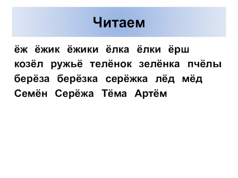 Читаемёж  ёжик  ёжики  ёлка  ёлки  ёршкозёл  ружьё  телёнок  зелёнка