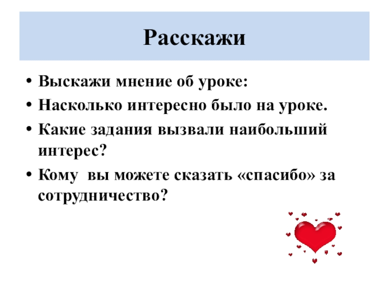 РасскажиВыскажи мнение об уроке:Насколько интересно было на уроке.Какие задания вызвали наибольший интерес? Кому вы можете сказать «спасибо»