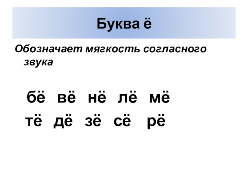 Буква ёОбозначает мягкость согласного звука	бё  вё  нё  лё  мё  тё  дё