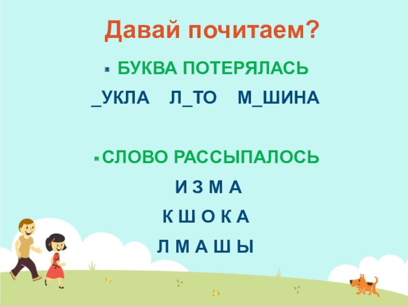 Давай почитаем? Буква потерялась _укла  л_то  м_шинаСлово рассыпалось и з м а к ш о