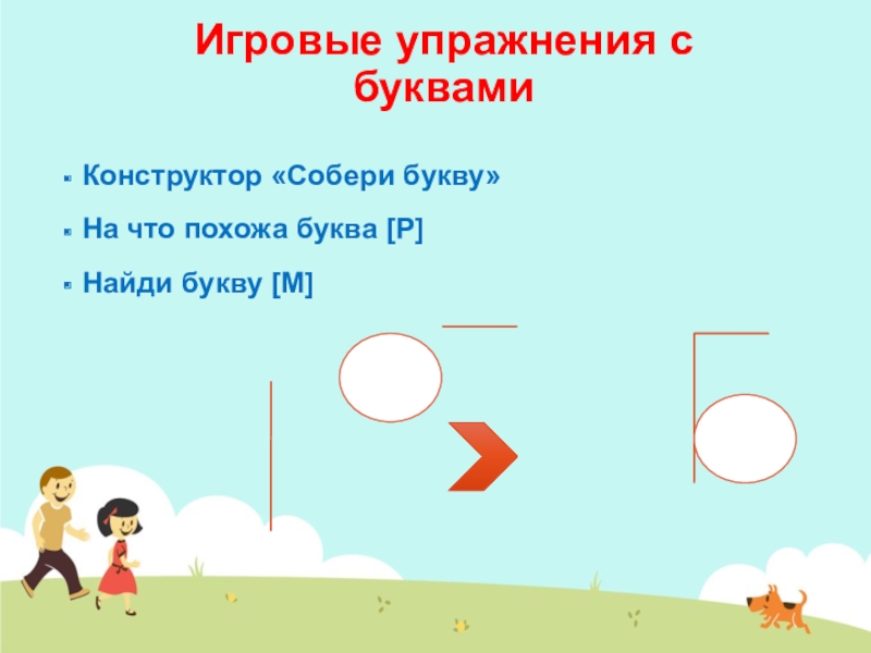 Игровые упражнения с буквамиКонструктор «Собери букву»На что похожа буква [Р]Найди букву [М]