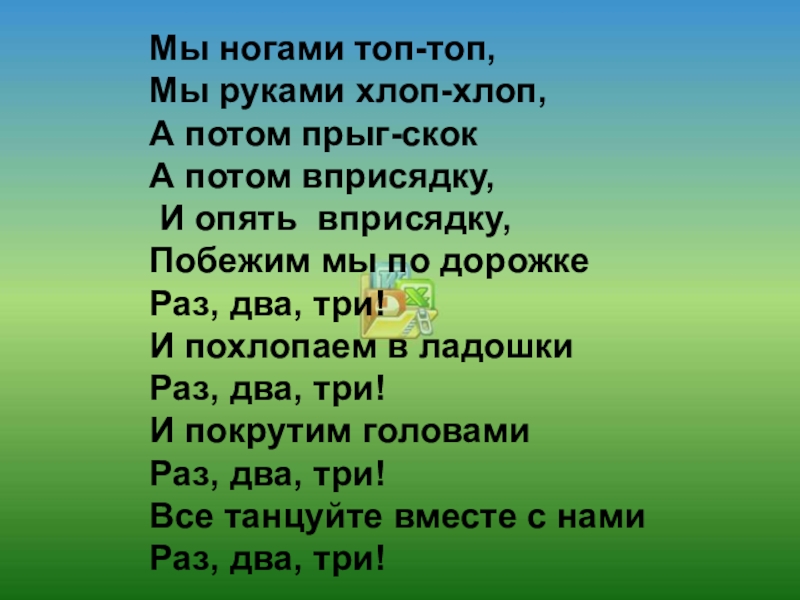 Мы ногами топ-топ,Мы руками хлоп-хлоп,А потом прыг-скокА потом вприсядку, И опять вприсядку,Побежим мы по дорожкеРаз, два, три!И