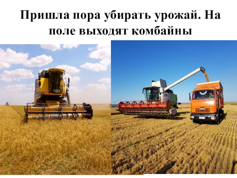 Слайд 12Пришла пора убирать урожай. На поле выходят комбайны