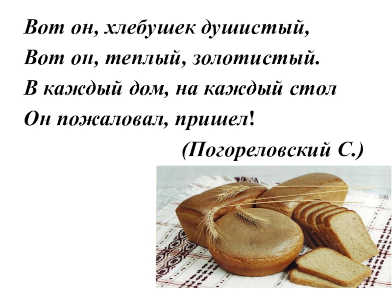 Вот он, хлебушек душистый,Вот он, теплый, золотистый.В каждый дом, на каждый столОн пожаловал, пришел!