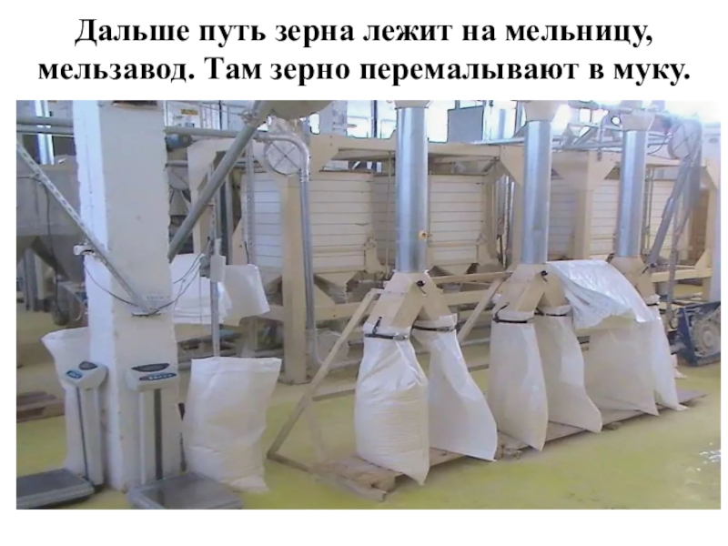 Слайд 14Дальше путь зерна лежит на мельницу, мельзавод. Там зерно перемалывают в
