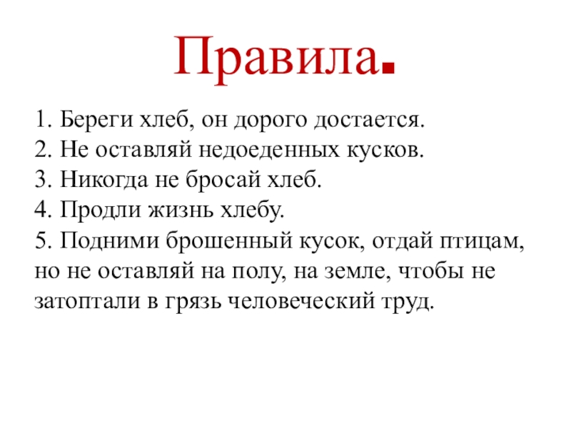 Правила.1. Береги хлеб, он дорого достается.  2. Не оставляй недоеденных кусков.  3. Никогда не бросай