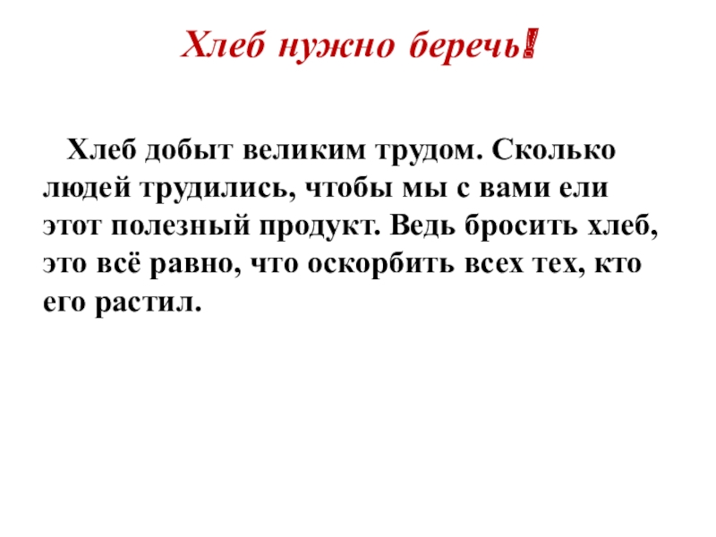 Хлеб нужно беречь!    Хлеб добыт великим трудом. Сколько людей трудились, чтобы мы с вами