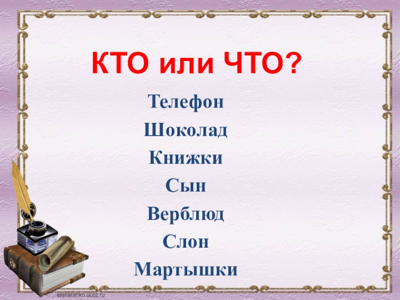 КТО или ЧТО?ТелефонШоколадКнижкиСынВерблюдСлонМартышки