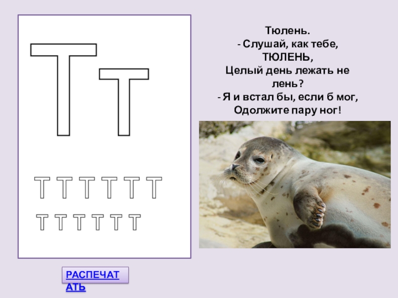 РАСПЕЧАТАТЬТюлень.  - Слушай, как тебе, ТЮЛЕНЬ,  Целый день лежать не лень?  - Я и