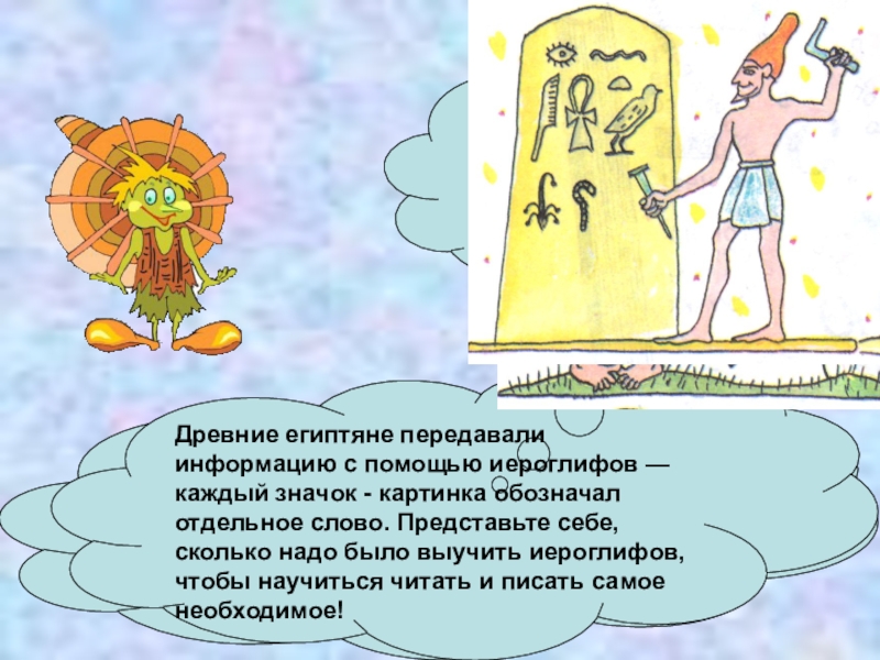 Древние египтяне передавали информацию с помощью иероглифов — каждый значок - картинка обозначал отдельное слово. Представьте себе, сколько надо было выучить иероглифов, чтобы научиться читать и писать самое необходимое!