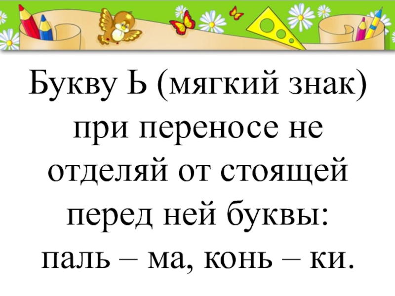 Букву Ь (мягкий знак) при переносе не отделяй от стоящей перед ней буквы:  паль – ма,