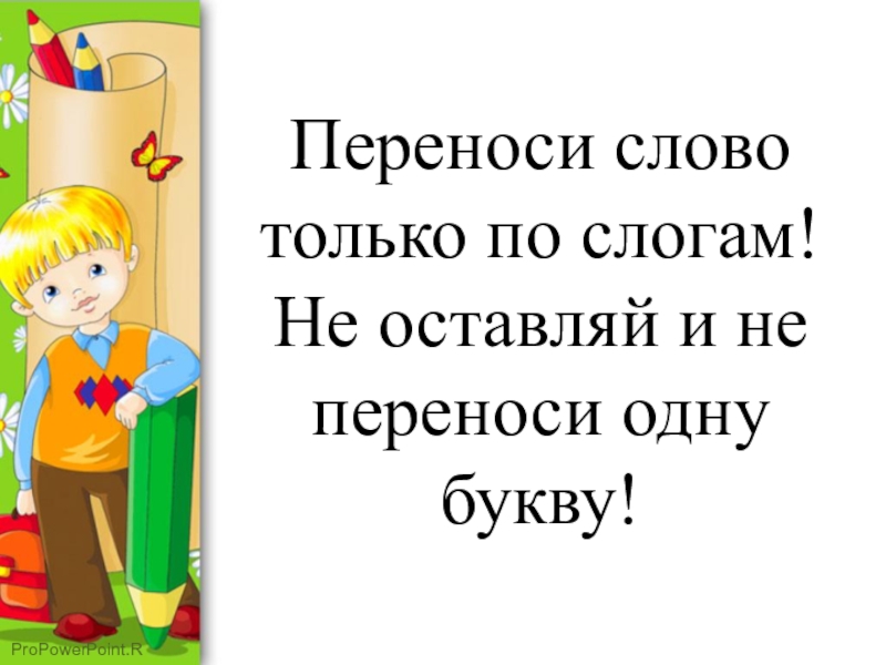 Слайд 2Переноси слово только по слогам! Не оставляй и не переноси одну