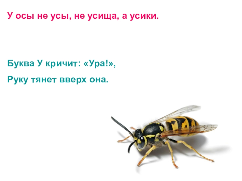 У осы не усы, не усища, а усики.Буква У кричит: «Ура!»,Руку тянет вверх она.