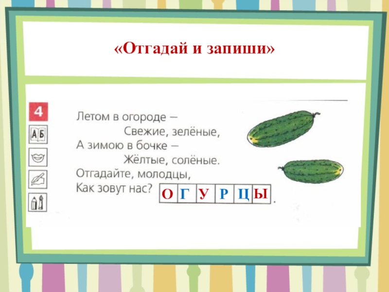 Игровые упражнения, чтение загадки, рисование огурцов в тетради в линейку.