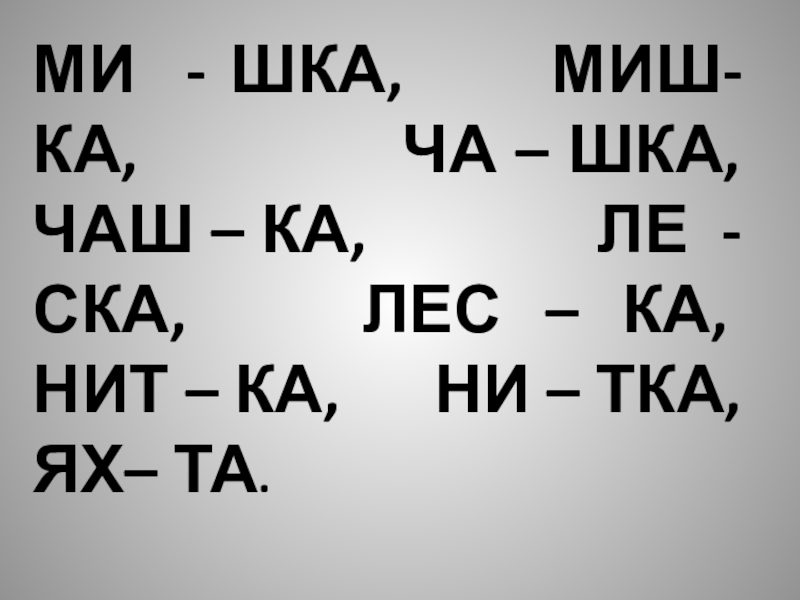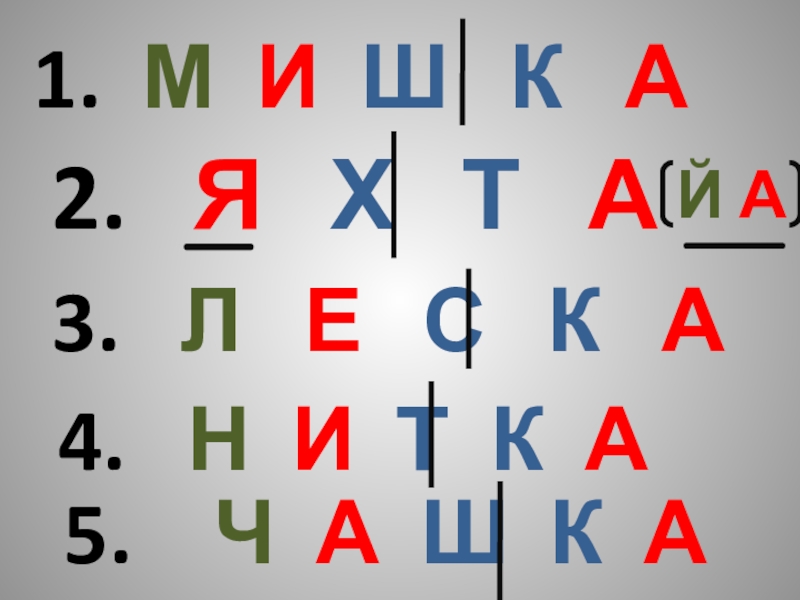Мишка, вишни, речка, яхта, леска, дочка, юнга, нитка, ёлка, сетка, чашка, вёсла, мешки, яшма.