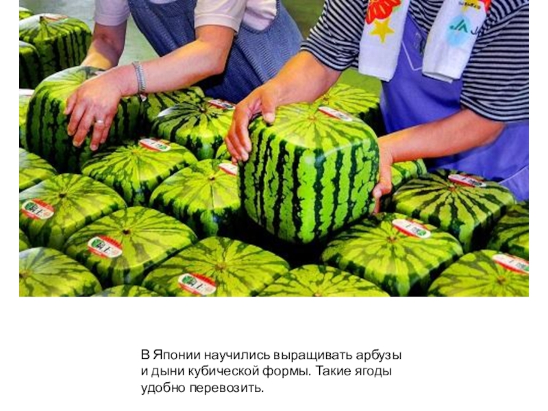 Слайд 7В Японии научились выращивать арбузы и дыни кубической формы. Такие ягоды
