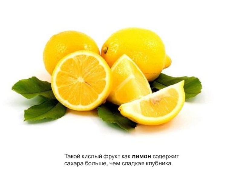 Слайд 8Такой кислый фрукт как лимон содержит сахара больше, чем сладкая клубника.