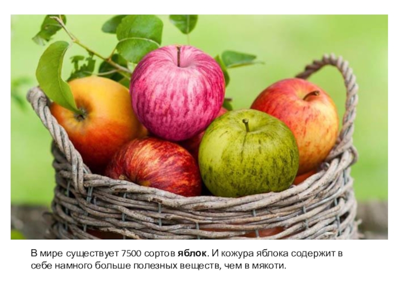 Слайд 4В мире существует 7500 сортов яблок. И кожура яблока содержит в себе