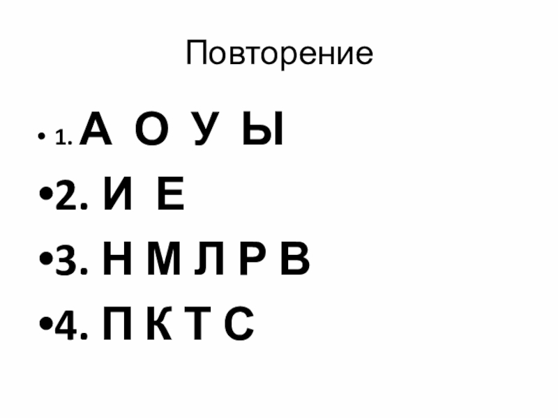 Повторение 1. А О У Ы 2. И Е 3. Н М Л Р В 4. П К Т С