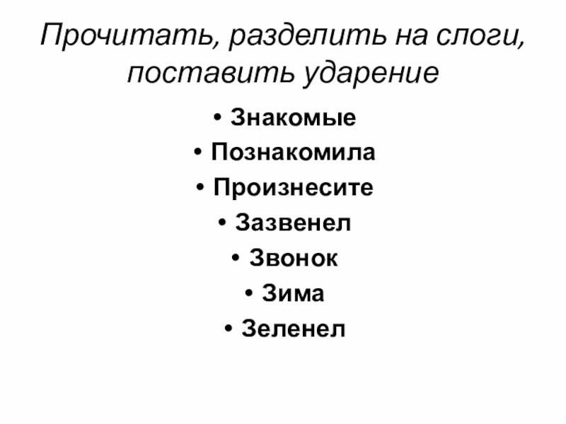 Прочитать, разделить на слоги, поставить ударениеЗнакомыеПознакомилаПроизнеситеЗазвенелЗвонокЗимаЗеленел